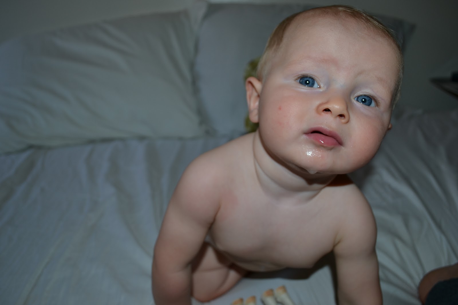 Miles is just a spastic when he nurses. He crawls all over me during it and I just accept that nursing is going to be intense. At night, he nurses perfectly, just because he is half asleep probably. I have a goal to not give up before a year. And I will keep that goal. My mom saw me nursing and she said, "Wow, I don't think you are going to nurse much longer." Ha! That is just Miles, he never sits still and is always diving and looking and exploring. Curious.